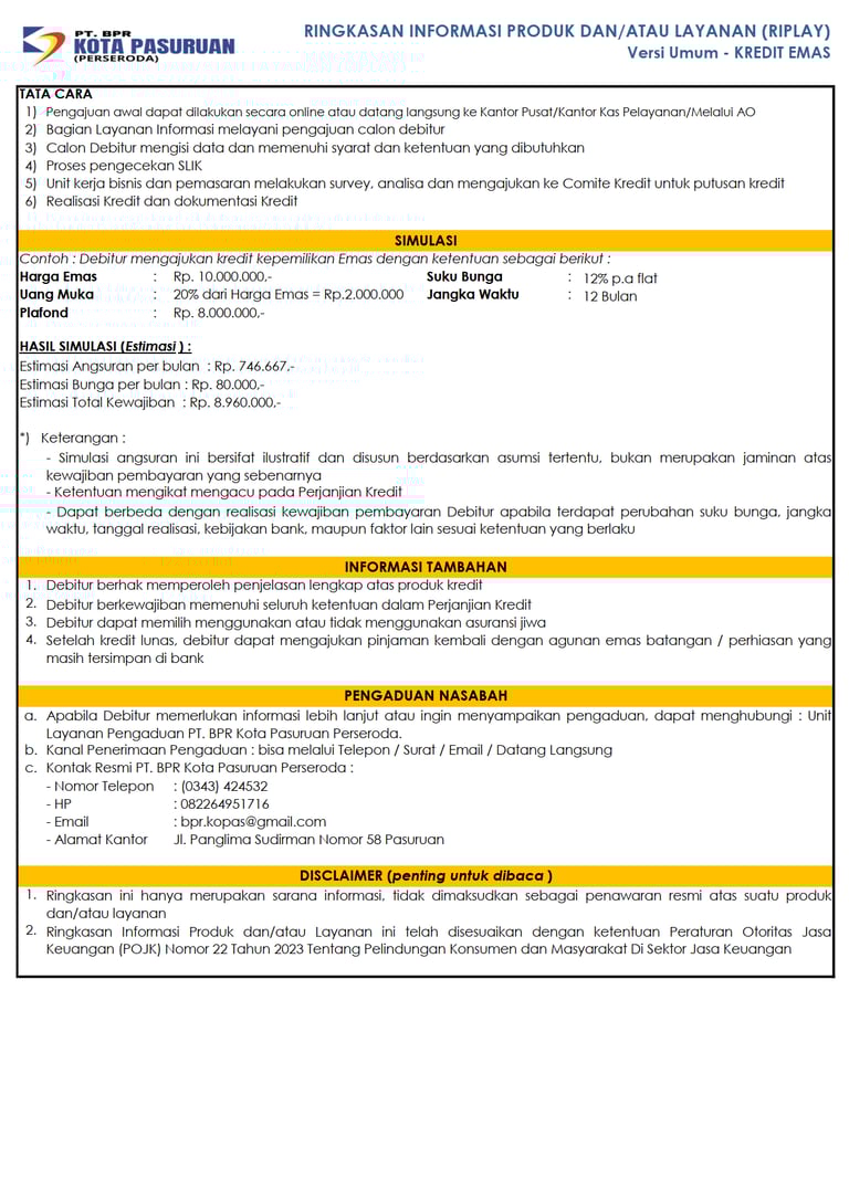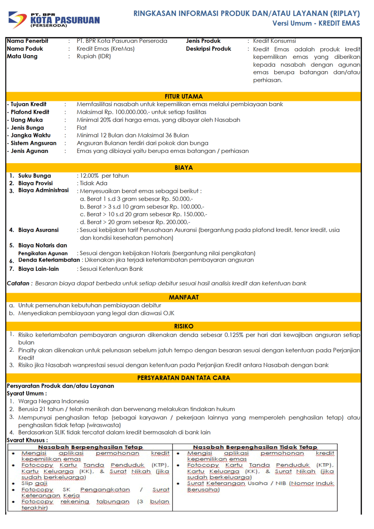 Kredit Emas adalah produk kredit kepemilikan emas yang diberikan kepada nasabah dengan agunan emas yang berupa emas batangan dan perhiasan.