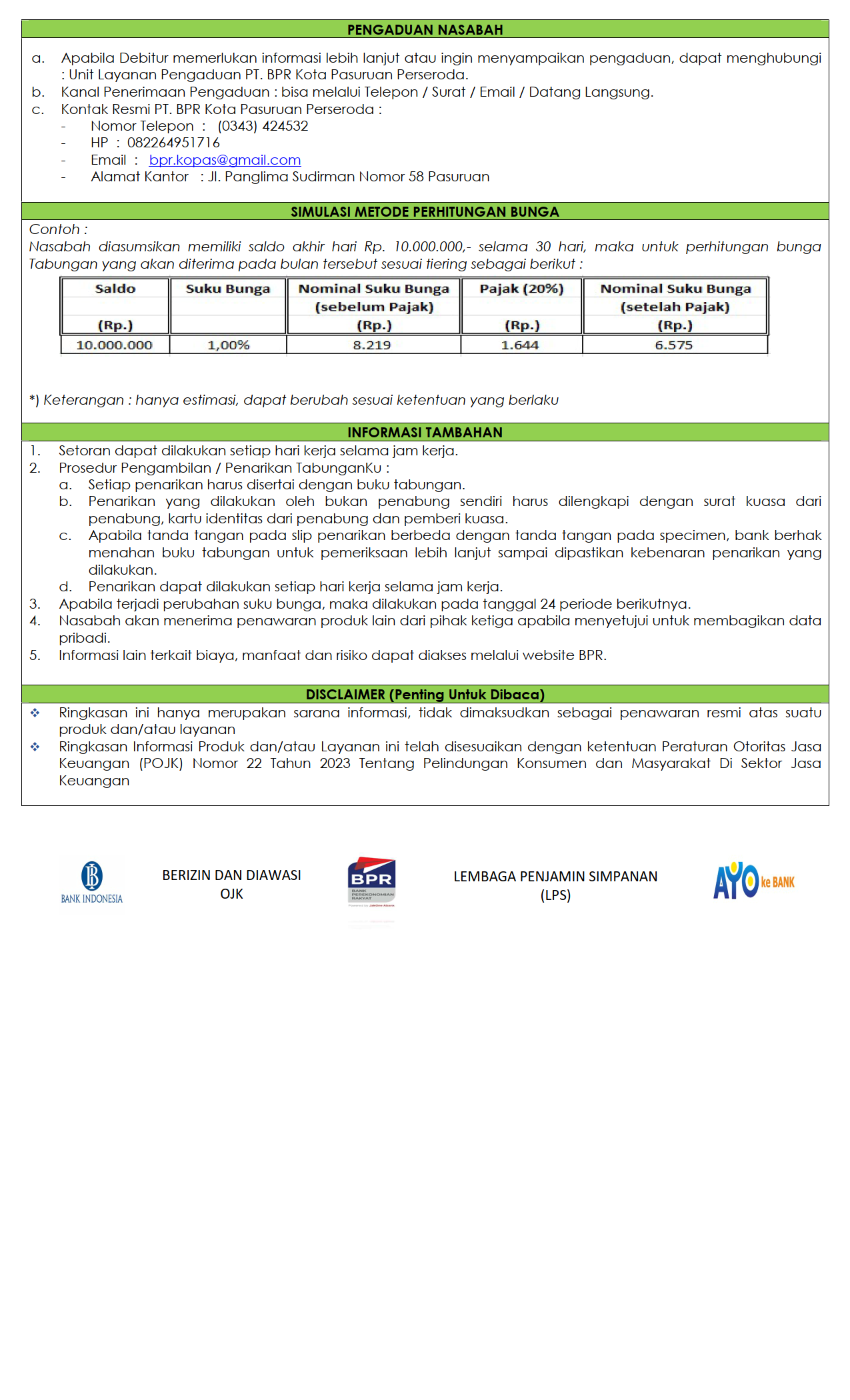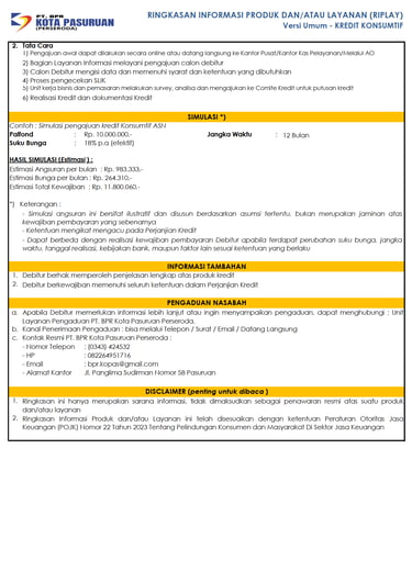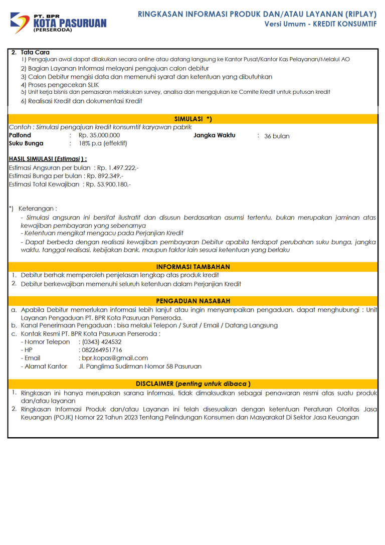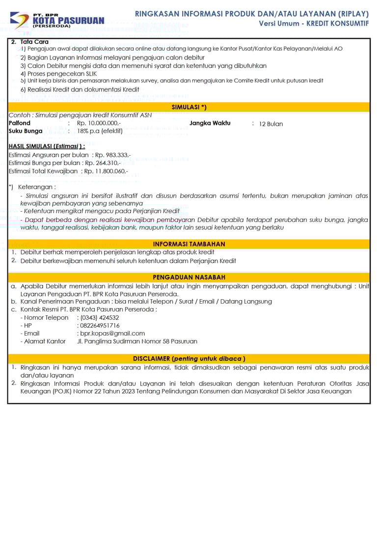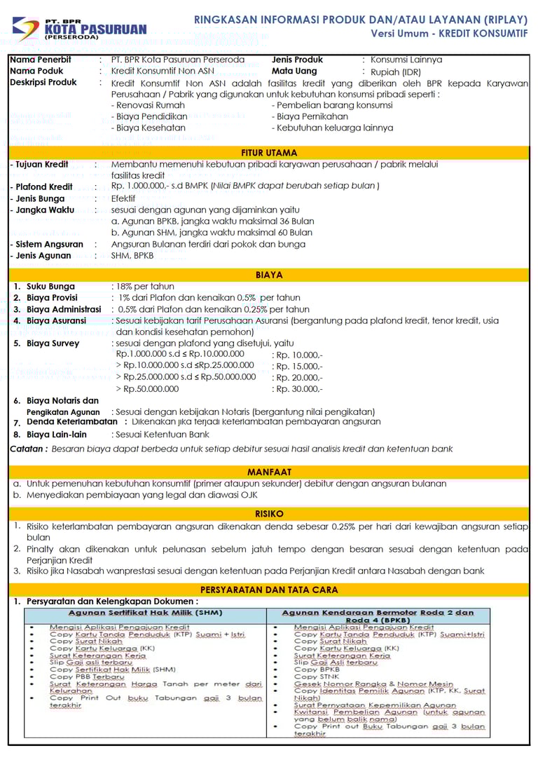 Kredit Konsumtif adalah fasilitas kredit PT. BPR Kota Pasuruan yang diperuntukkan bagi pegawai (ASN, POLRI, TNI) dan karyawan perusahaan (BUMN, BUMD, dan Perusahaan Lainnya) yang mempunyai penghasilan tetap. Kredit Konsumtif juga dapat diperuntukan Pegawai Kontrak / PHL dengan jangka waktu sesuai dengan masa kerja.