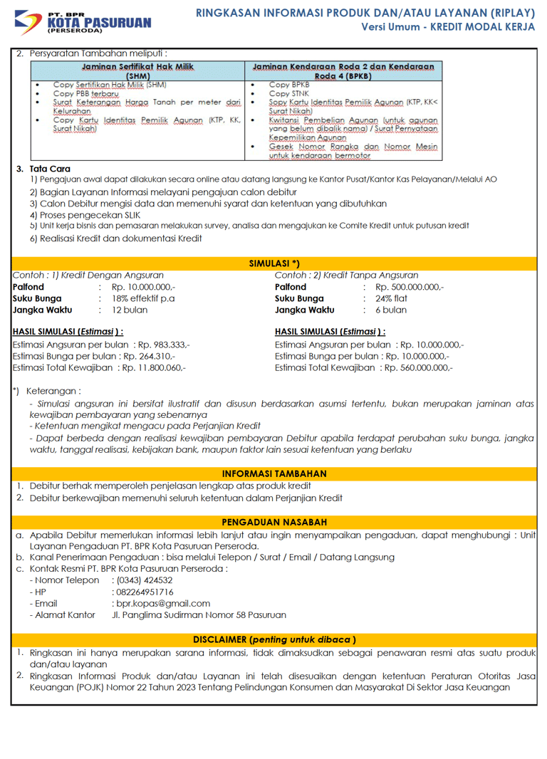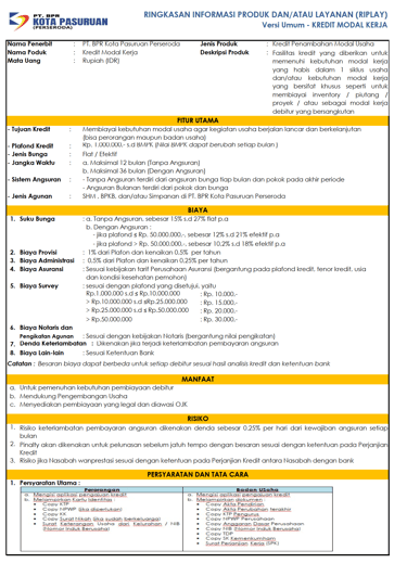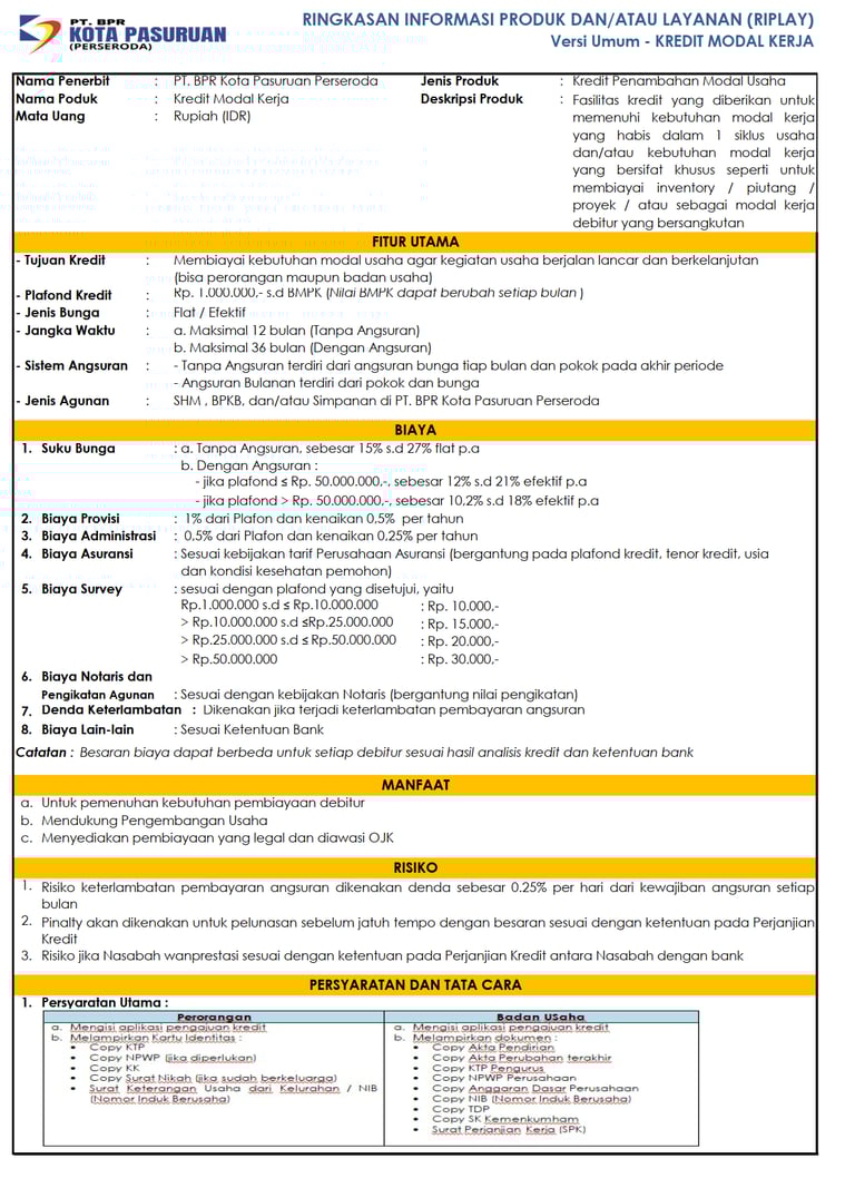 Kredit Modal Kerja Adalah fasilitas kredit yang diberikan PT. BPR Kota Pasuruan untuk memenuhi kebutuhan modal kerja yang habis dalam satu siklus usaha dan atau kebutuhan modal kerja yang bersifat khusus seperti untuk membiayai inventory / piutang / proyek atau kebutuhan khusus lainnya.