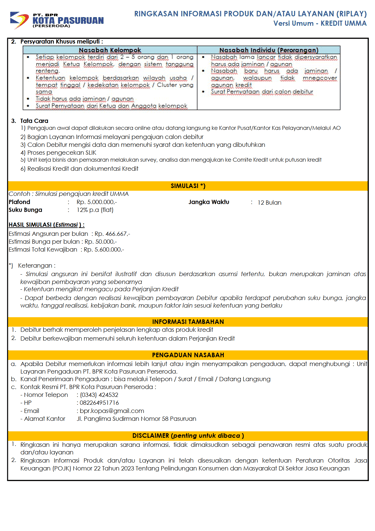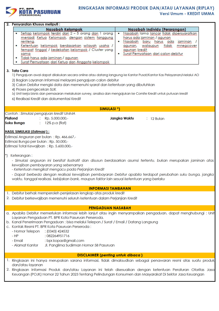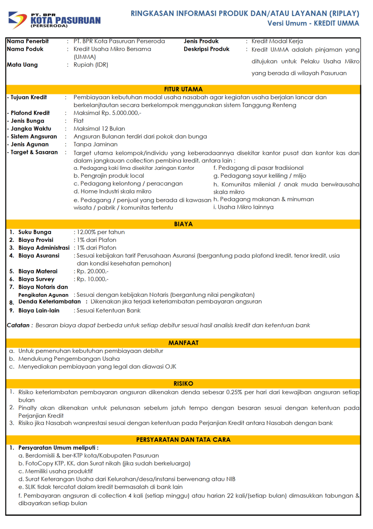 Kredit Usaha Mikro bersaMA (UMMA) merupakan Produk Kredit terbaru PT. BPR Kota Pasuruan yang khusus diberikan kepada masyarakat UMKM yang bertempat tinggal di Pasuruan, dengan plafond maksimal Rp. 5.000.000 dan jangka waktu maksimal 12 bulan.