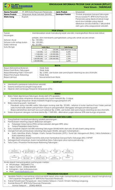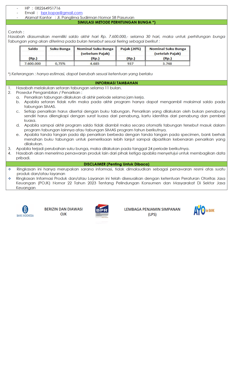 Tabungan SIMAS adalah Produk simpanan berupa tabungan khusus pada PT. BPR Kota Pasuruan yang diperuntukan bagi siswa – siswi pelajar yang dapat dilakukan secara individu / dikoordinir oleh guru atau paguyuban sekolah.