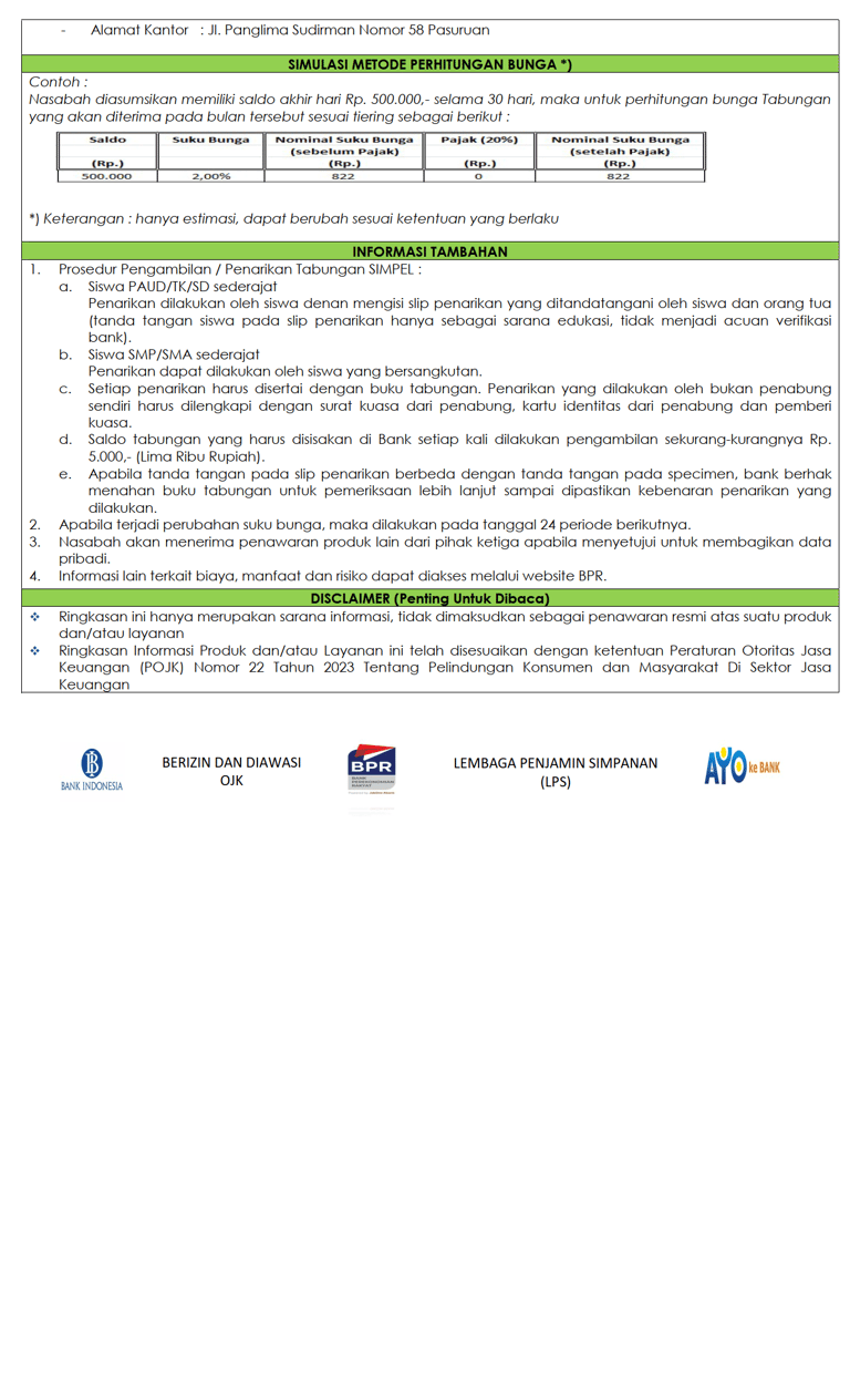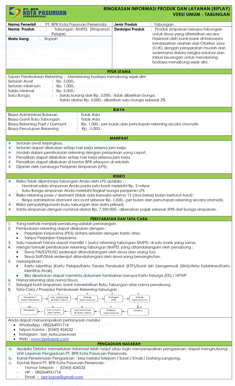 Tabungan SIMPEL merupakan Produk simpanan berupa tabungan khusus yang dikeluarkan oleh Otoritas Jasa Keuangan (OJK) yang Diperuntukkan bagi siswa PAUD/TK/RA, SD/MI/MTs, SMA/MA atau sederajat